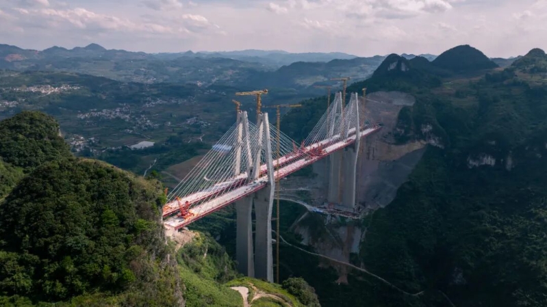 9月5日,由昆侖集團(tuán)投資建設(shè)、中國鐵建大橋局承建的烏當(dāng)(羊昌)至長順高速公路控制性工程——金旗特大橋順利合龍。該橋在塔梁固結(jié)體系的雙塔雙索面斜拉橋類型中,建設(shè)規(guī)模與橋梁高度均為世界第一,為有“橋梁博物館”美譽(yù)的貴州再添新地標(biāo)。